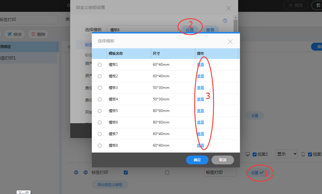 2、打开标签打印设置窗口,点击设置,在弹出的模板列表中依次点击查看,找到一个与要新增的模板相似的模板。