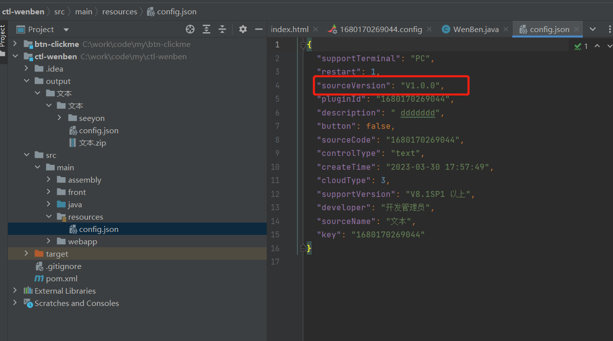 5、控件更新安装需要加大config.json的版本号siyrceVersion的值,修改完成后在打包或者打包了后在修改;
