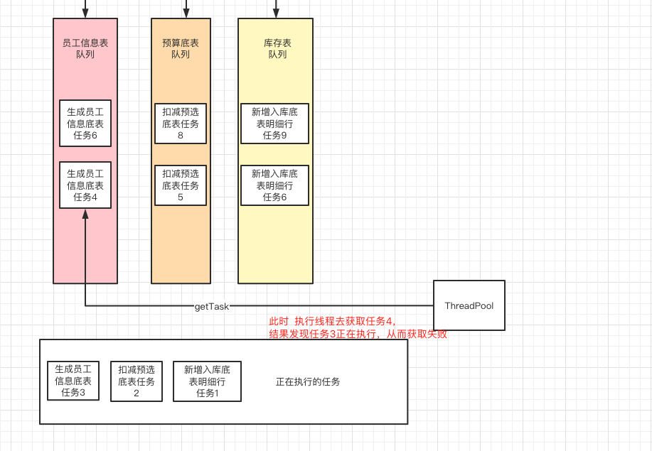 然后触发线程会分别从不同的队列中获取任务,当发现现在正在执行中的任务里,存在和当前正在取的任务目标表ID 相同时,则直接返回,否则,就可以取出来执行具体任务