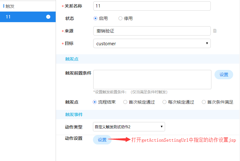 另外,如果是有界面自定义触发,则需要在xxxController中增加getActionSettingUrl中指定的页面跳转方法,同时增加对应的jsp,此jsp就是具体的自定义触发动作的设置界面。