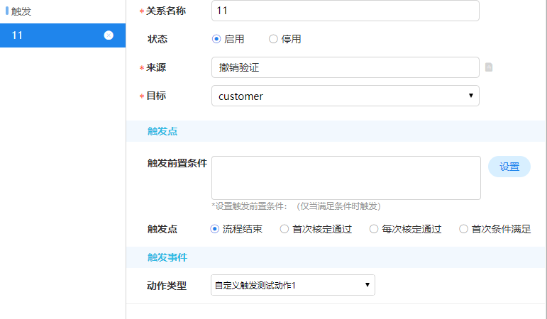 注意,父类有个默认实现方法checkFieldInActionSet,此方法是去处理修改字段时校验此字段是否参与触发关系设置的。如果业务需要进行校验,重写的时候如果有参与设置,则返回值必须为FormTriggerBean.CheckResultEnum.customerAction.getKey();没有参与,则返回值必须为FormTriggerBean.CheckResultEnum.none.getKey(),不能为其他值,否则修改表单字段后保存会报异常。
