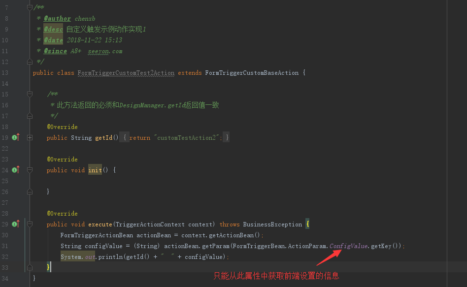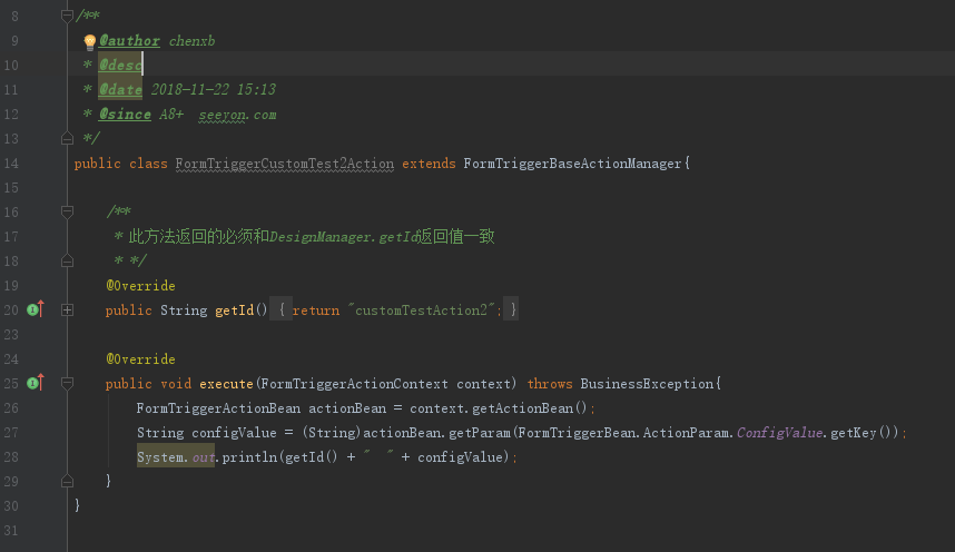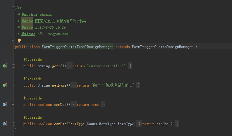 FormTriggerCustomBaseAction 自定义触发运行抽象父类 FormTriggerCustomTest1Action 无界面自定义触发运行类 FormTriggerCustomTest2Action 有界面自定义触发运行类