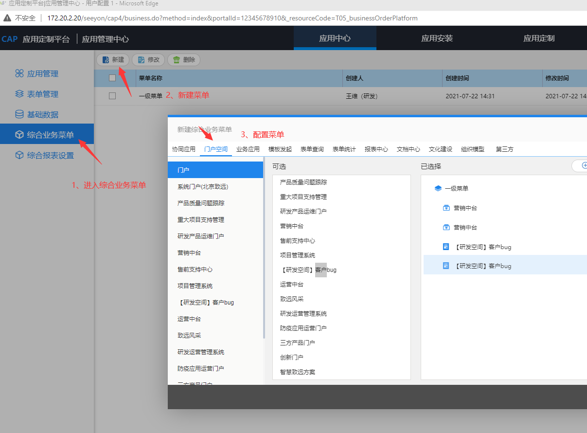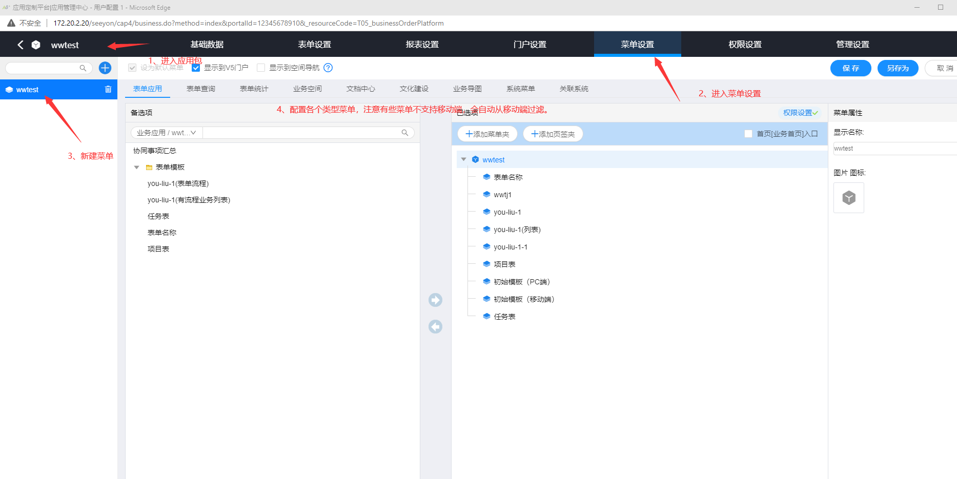 菜单栏目需要支持应用菜单和综合业务菜单。pc端基本都支持,移动端会自动过滤不支持的类型。