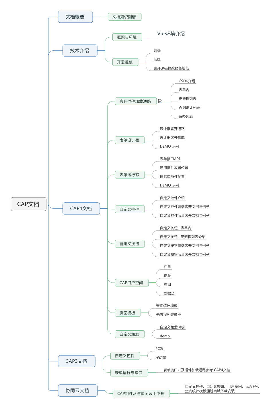 CAP开发文档涵盖了基础业务组件、统计组件、栏目组件、自定义控件、自定义按钮、前后端API及针对客开的设计器配置和运行态接口的使用细则,文档总体结构如下: