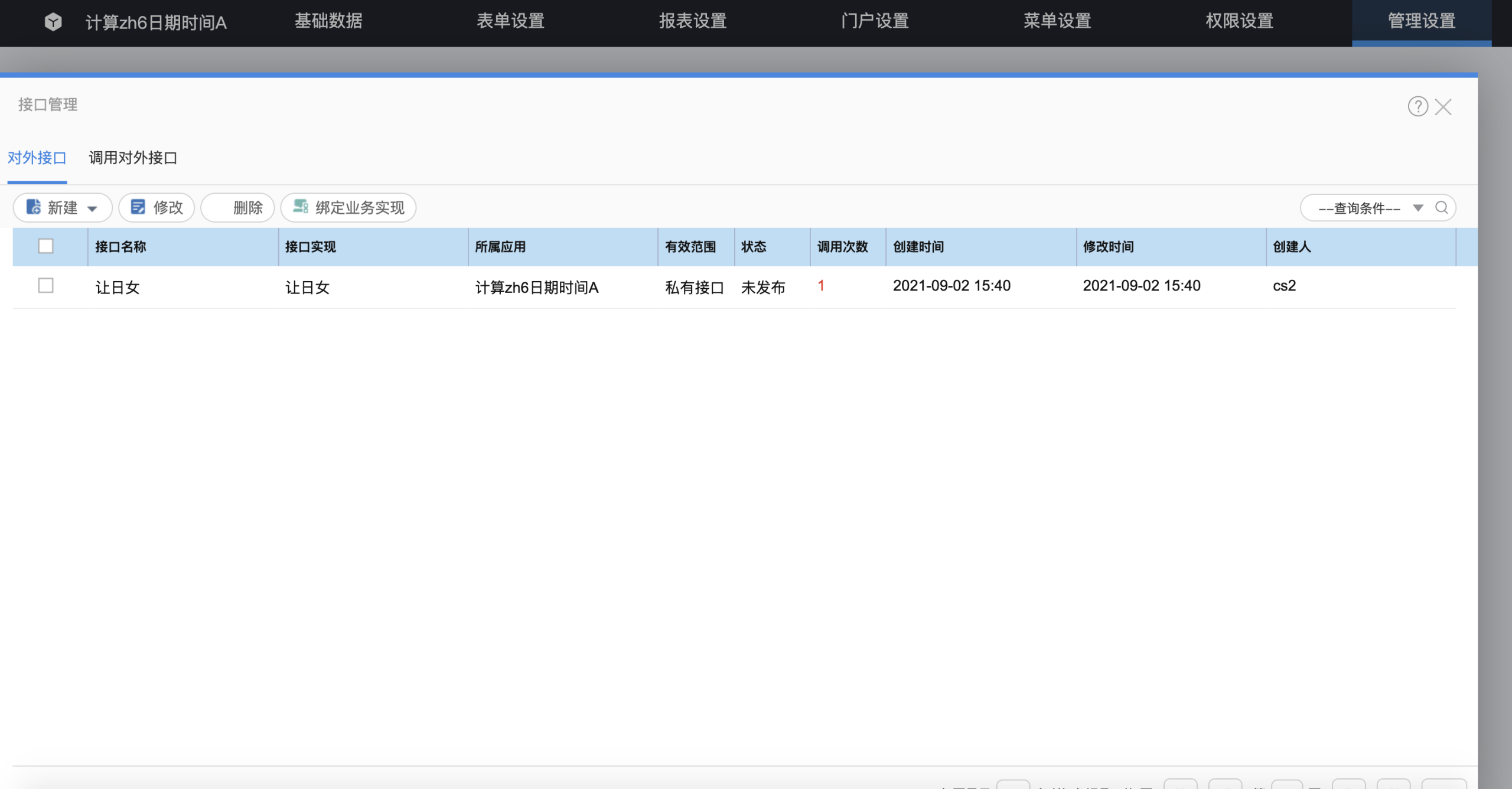 # (1)应用应用设计师进入业务包-->管理设置-->接口管理
