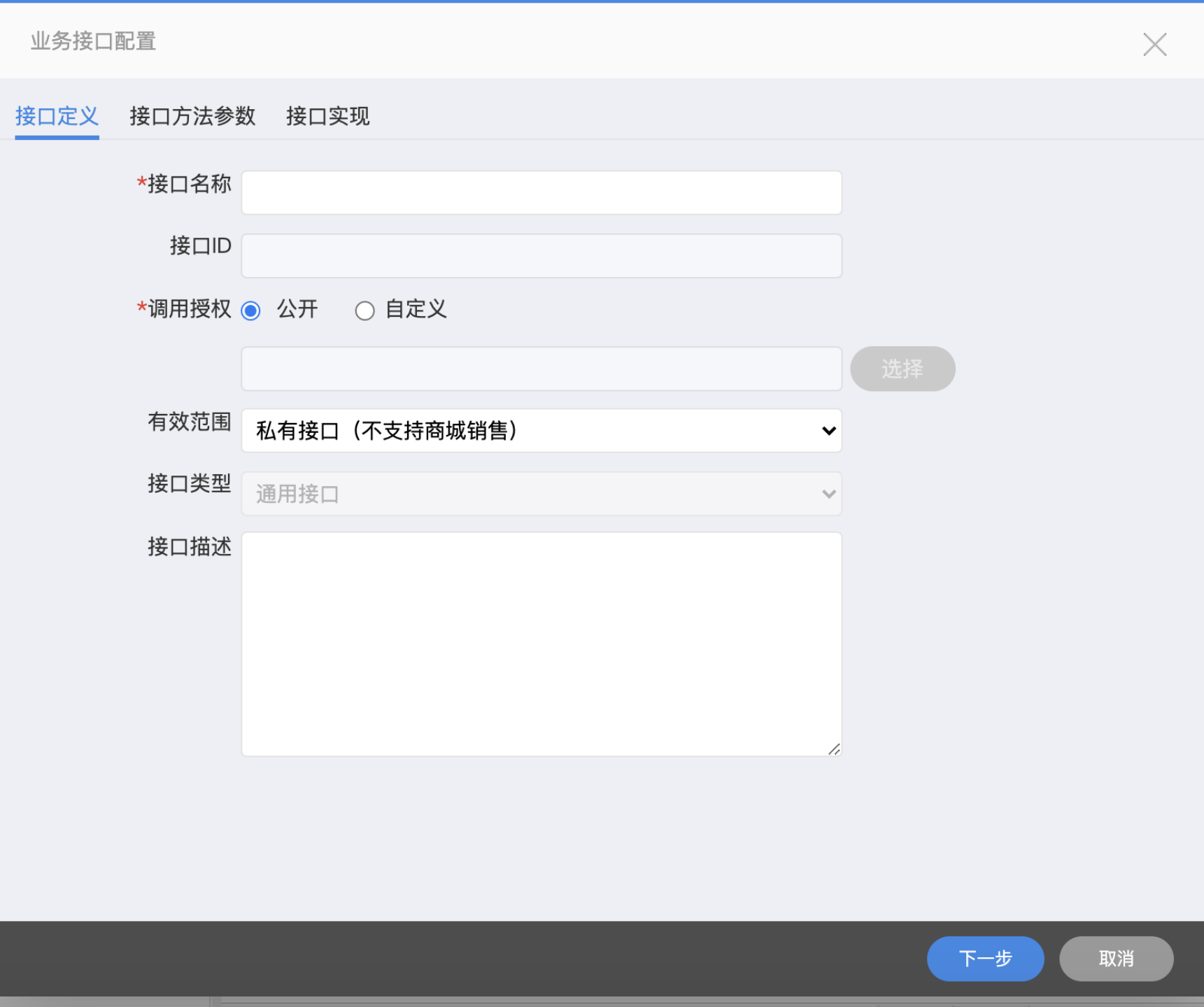 # (2) 调用授权,默认是公开,标识所有的业务包都能调用;也可以选择自定义指定某些业务包能够调用,
