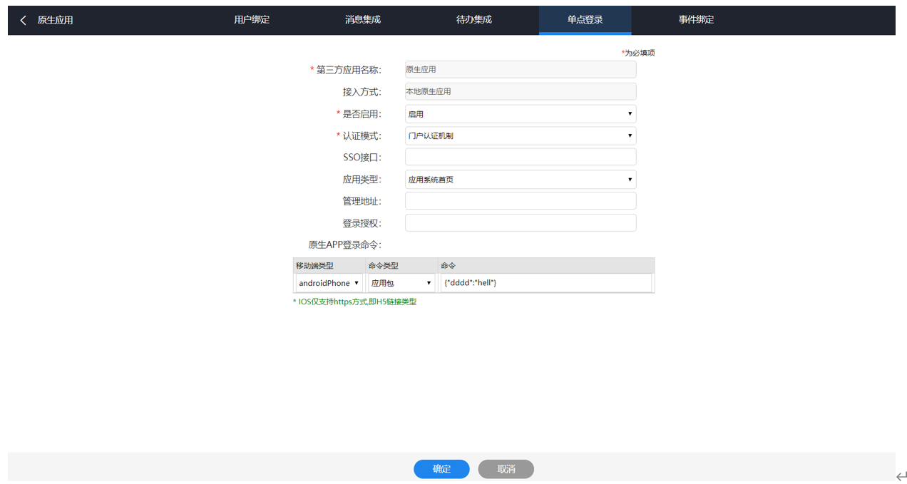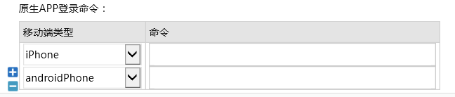 【本地原生应用】: 只有本地原生应用类型会显示出登录命令的配置页面,支持IOS,android,Windows 命令的配置。