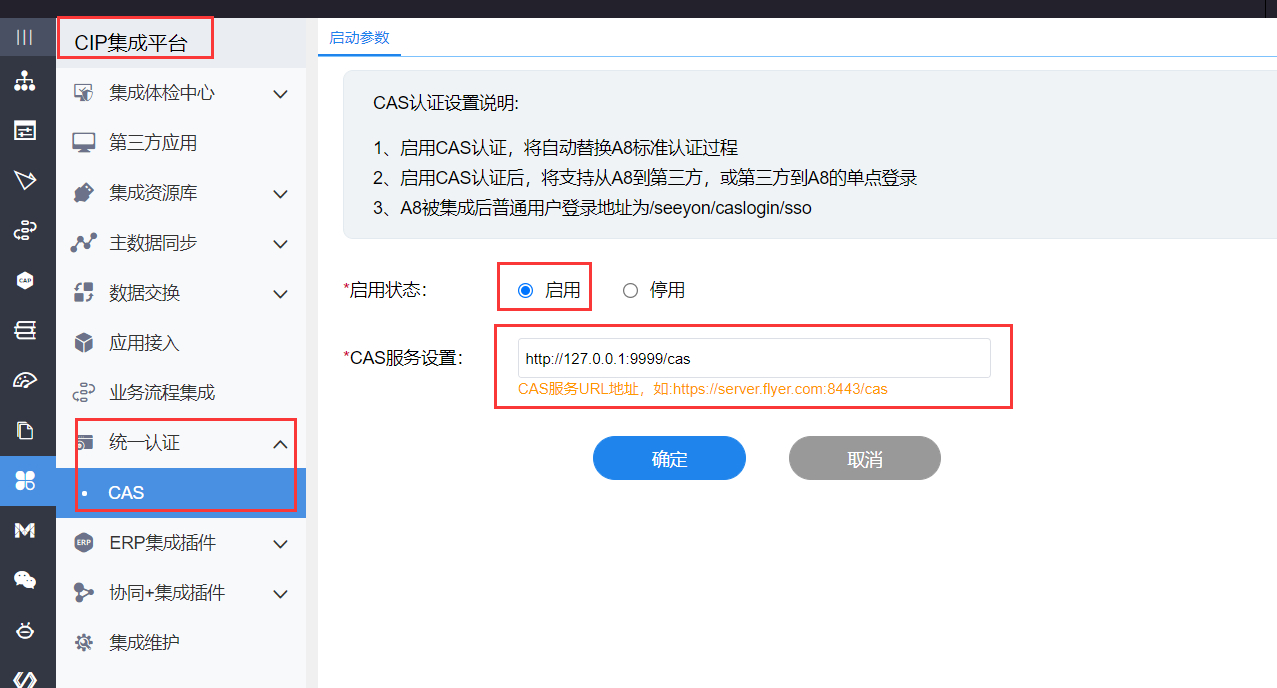 10、oa登录管理员用户,进入cas菜单,配置cas服务地址,选择启用,点击确定。