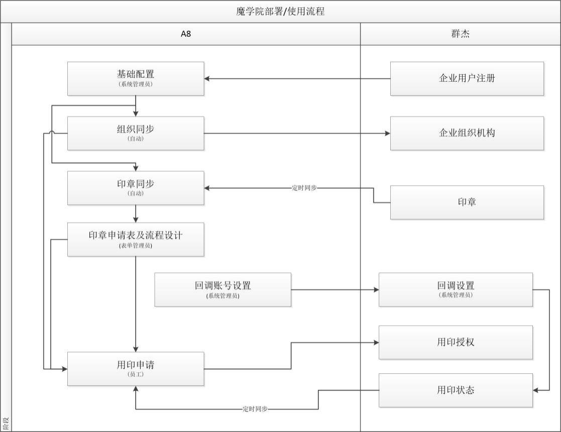 流程需包含一个审批节点,审批不通过则流程接收;审批通过则向群杰系统提交用印授权,同时生成用印校验码回写到表单中,所以审批节点的下一节点需为实际用印人,实际用印人通过用印校验码使用群杰的盖章设备。