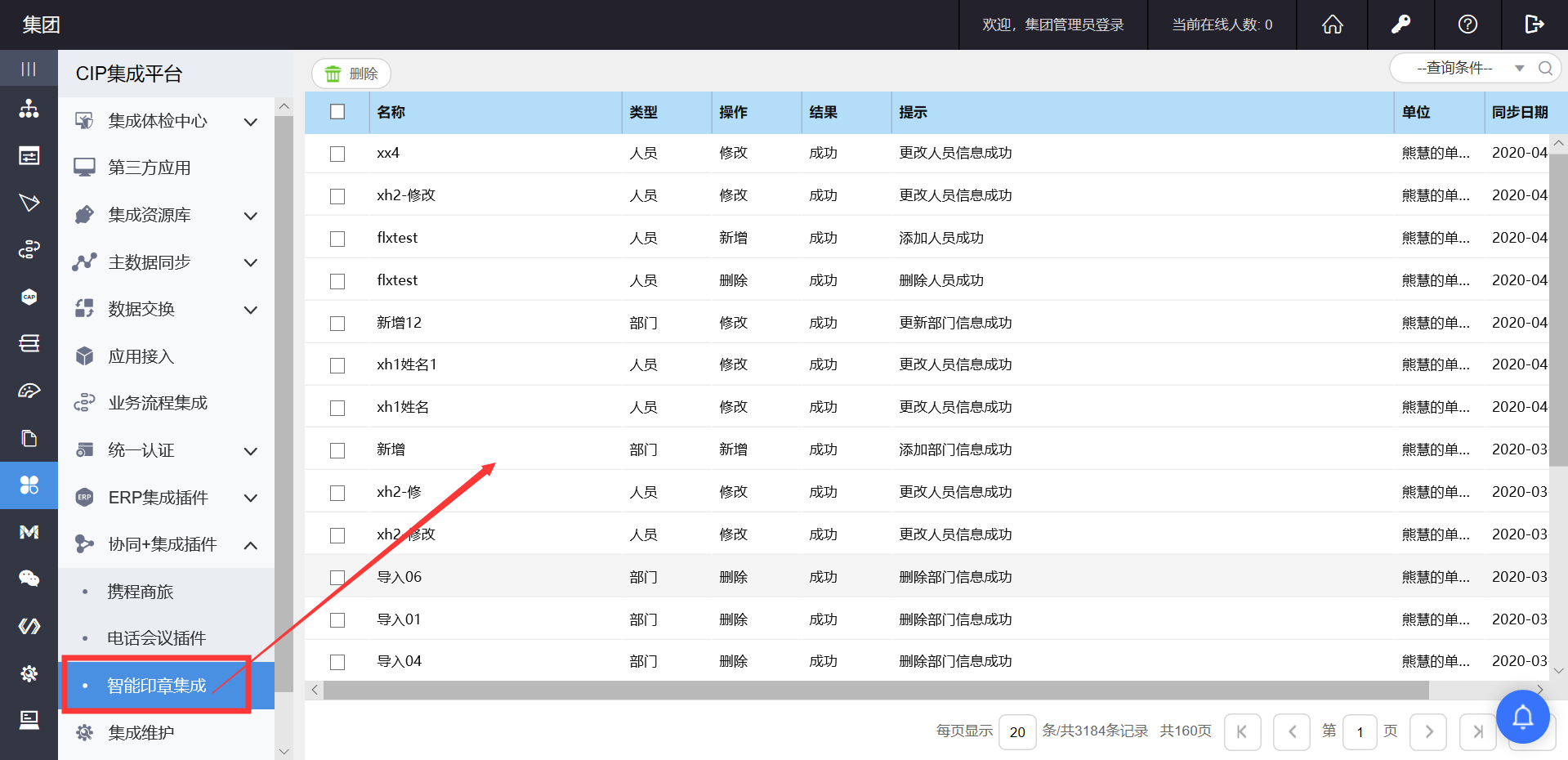 记录同步结果,提供删除、按姓名、类型、操作、结果、时间进行查询。