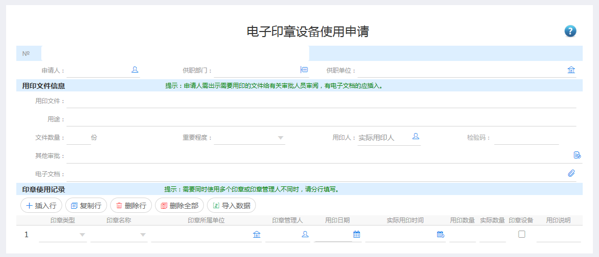 当用印需求(例如:合同用印)出现时,由经办人在致远协同中发起用印申请审批流程,填写用印日期、文件类型、用印事由等主表信息,在明细表中填写本次申请用印的印章类型、印章名称、用印次数等信息。实际用印时间和实际用印次数,由群杰返回,不填。