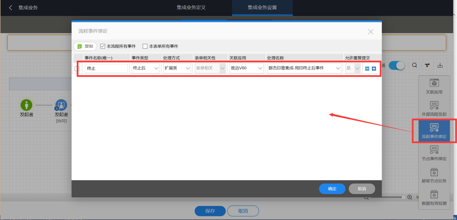 创建流程事件-用印终止事件:其中事件类型选择"终止后",处理方式选择"扩展类",处理名称从下拉列表中选择"群杰印章集成-用印终止后事件"