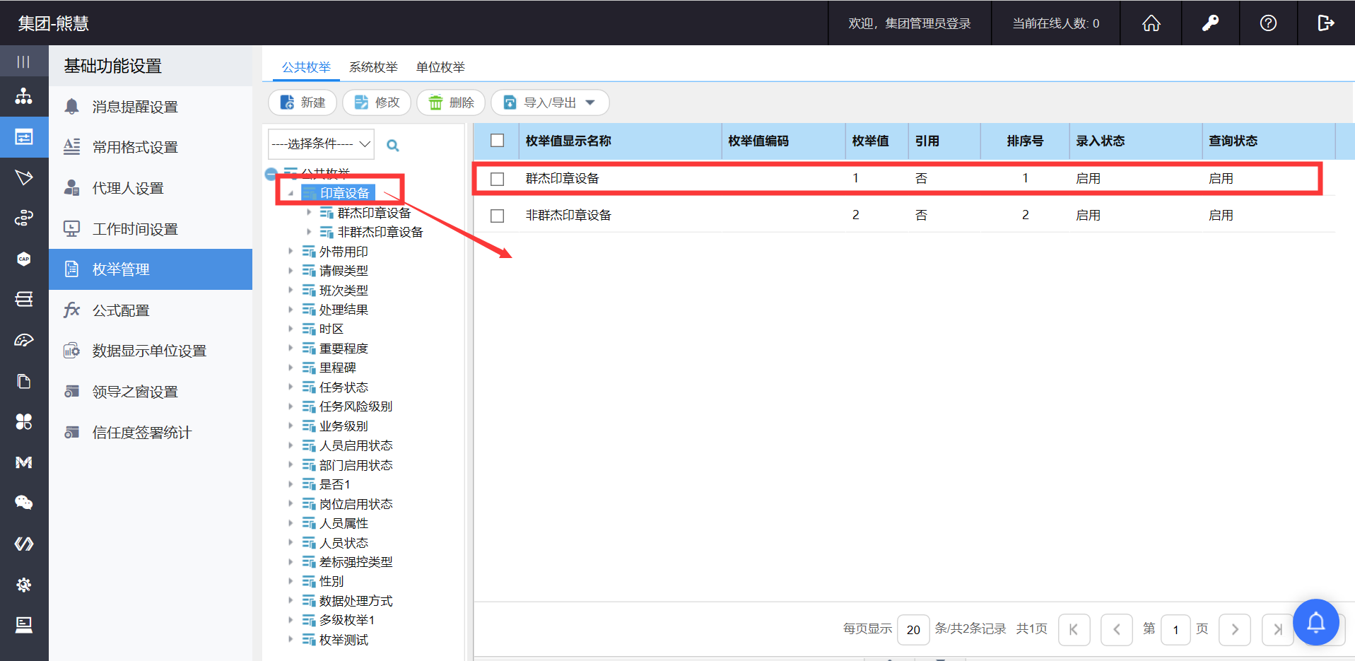 印章设备同步到 OA 系统中作为公共枚举:盖章设备,供印章审批流程表单使用。为了兼容非群杰用章场景,印章设备枚举设置为2级枚举。