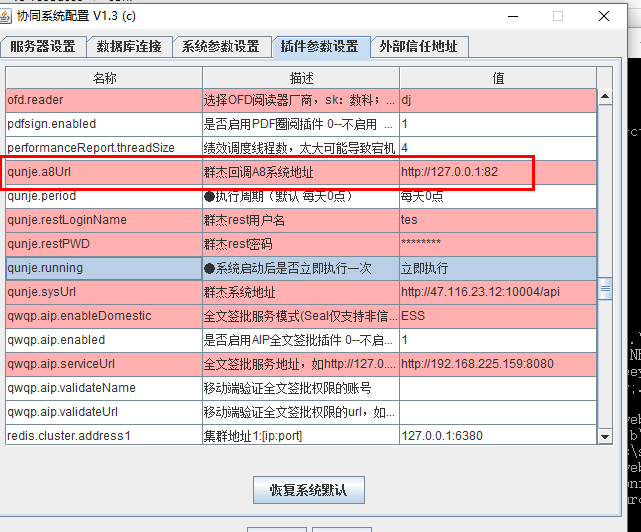 运行"{A8Home}/ApacheJetspeed/conf"下seeyonconfig配置程序。打开【A8 应用配置器】,进入【插件参数设置】页签,设置相关参数后,重启A8。见图参数配置说明: