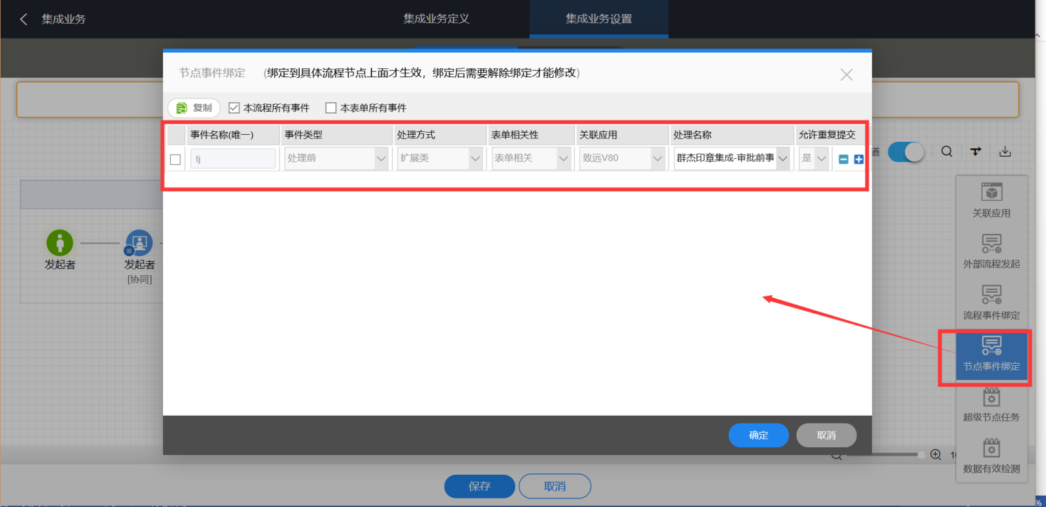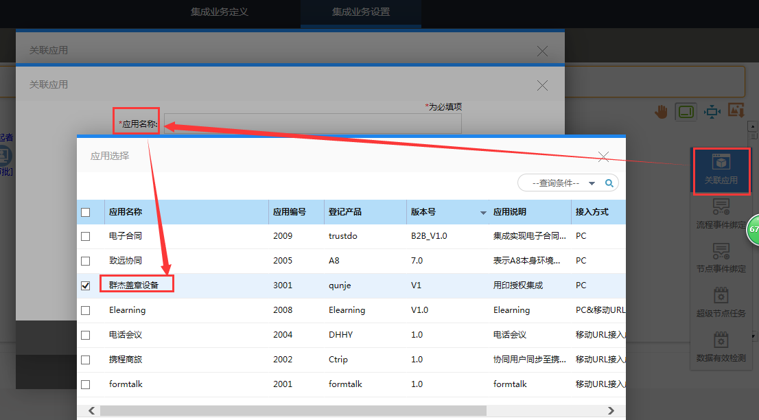 集成业务定义中表单流程模板名称选择对应的用印申请表单。