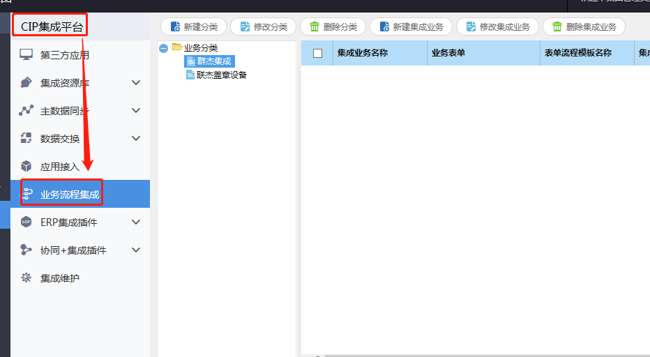 第三步,在新建的业务分类下新建集成业务。