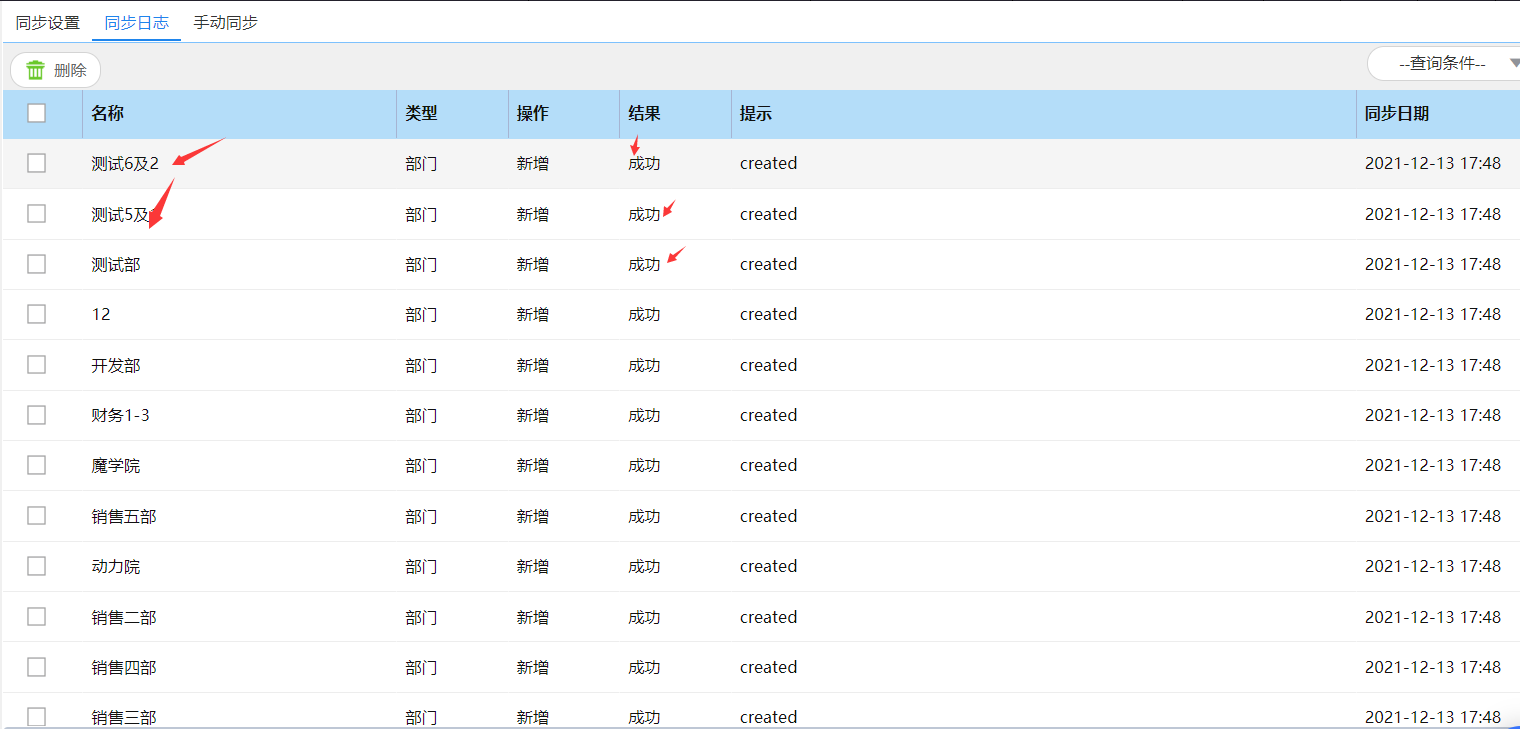 # 切换到【同步日志】页签,看部门、岗位、职级是否都同步成功了