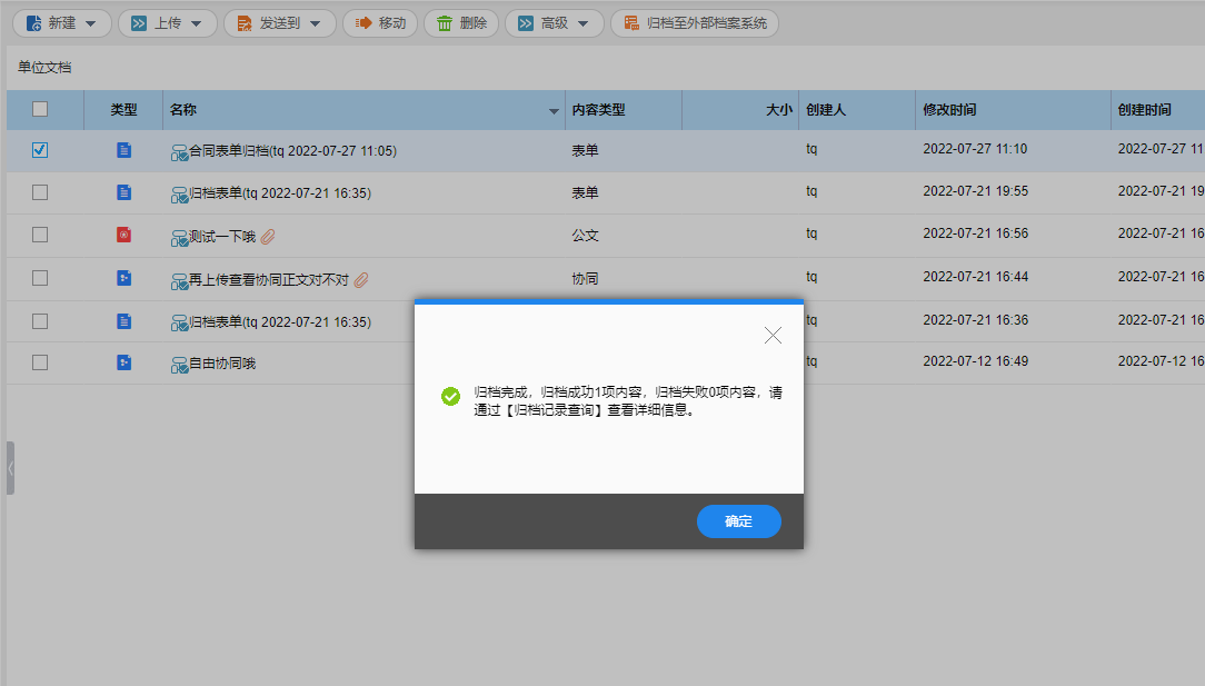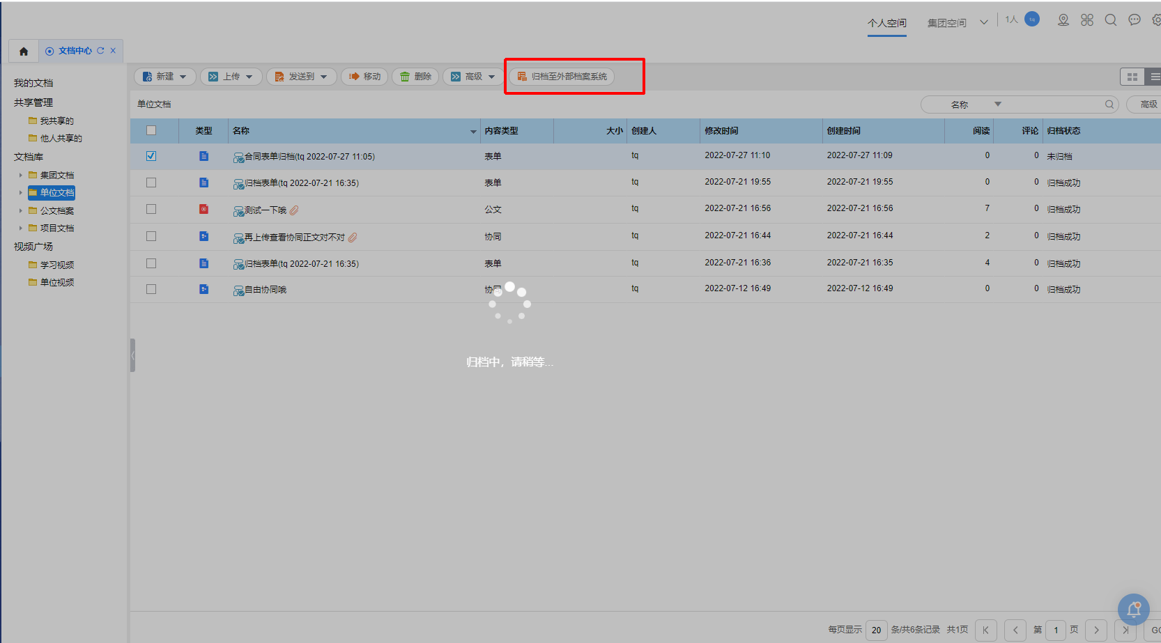 步骤2、选择相应的表单,点击"归档至外部档案系统",会出现归档中的状态,归档完成后会有相应的弹框提示