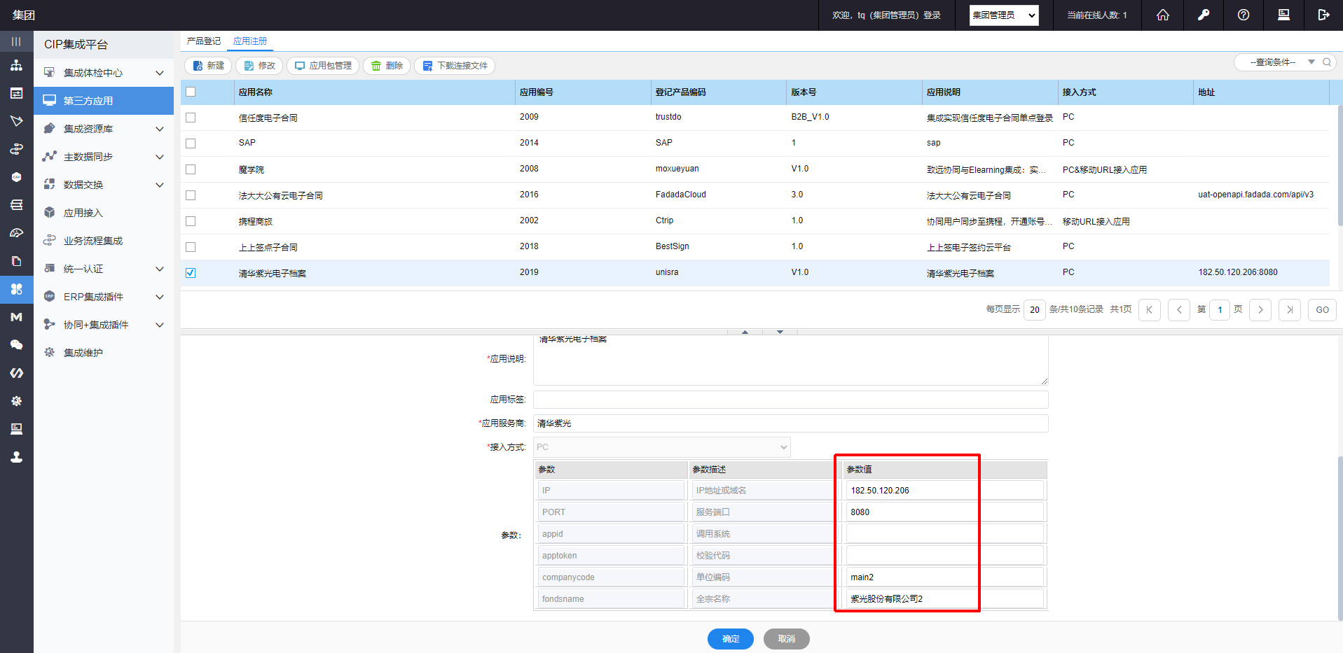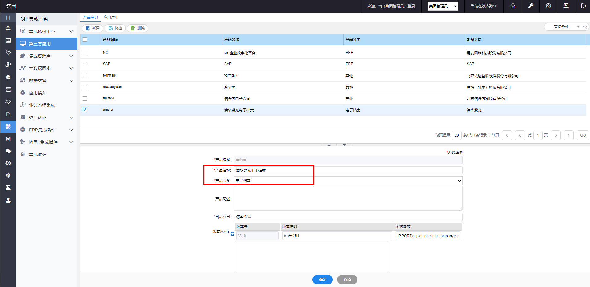 集团管理员进入"CIP集成平台"-"第三方应用"-"产品登记"中,清华紫光电子档案将进行预置登记,产品分类中增加"电子档案"分类,第三方产品参数中增加appid(调用系统)、apptoken(校验代码)、companycode(单位编码)、fondsname(全宗名称),需要配置人员录入这四个字段的值,然后保留到配置数据中。