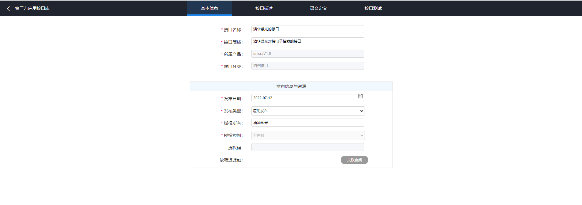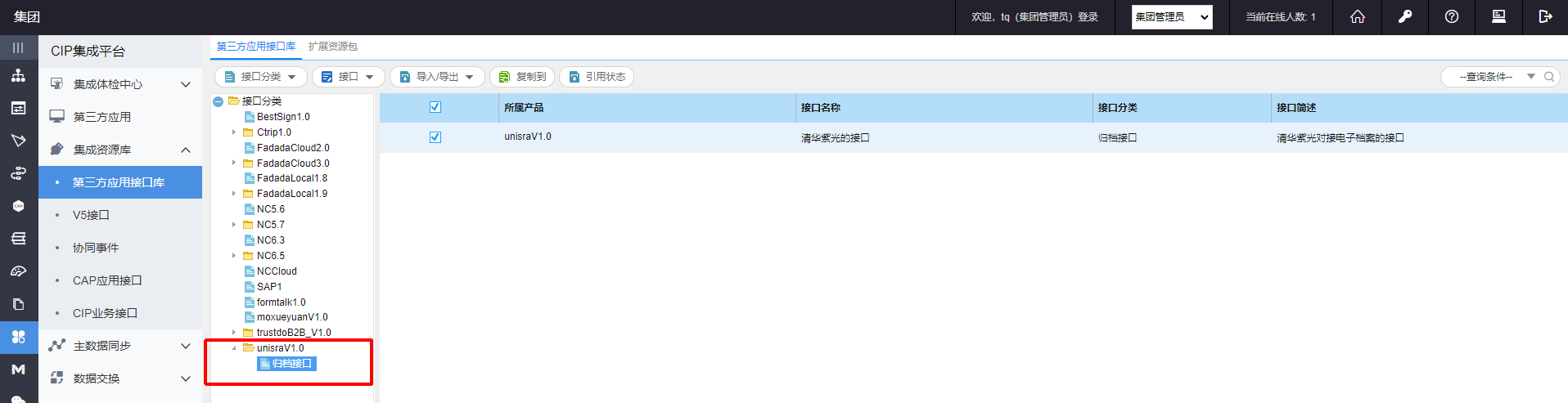 集团管理员进入"CIP集成平台"-"集成资源库"-"第三方应用接口库"中,找到对应的清华紫光电子档案产品编码的接口分类,在二级分类下新建接口
