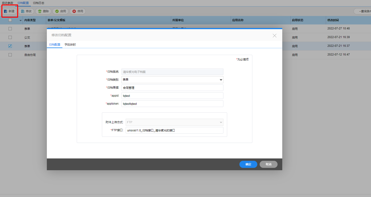 首先,新建归档配置,选择对应的归档类别(自由协同,表单,公文),选择归档单据(单据可选该集团下所有的流程表单/公文单,自由协同无需选择归档单据),填写appid和apptoken(紫光的对外接口,可在紫光系统进行配置),选择FTP接口
