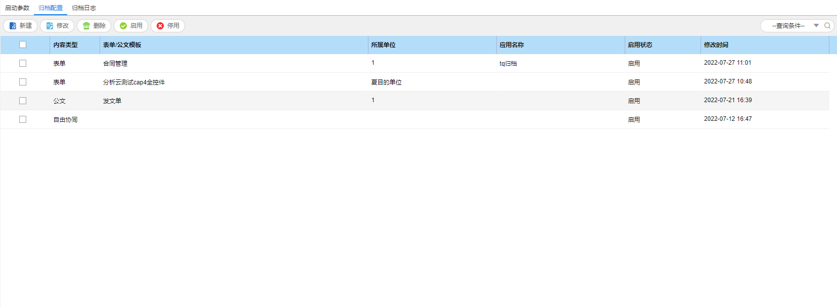 最后,归档配置完成后,可在配置列表中查看此配置,也可以进行,修改,删除,停用和启用操作(归档配置被删除,或者被停用后,则无法对该表单/公文/协同进行归档)