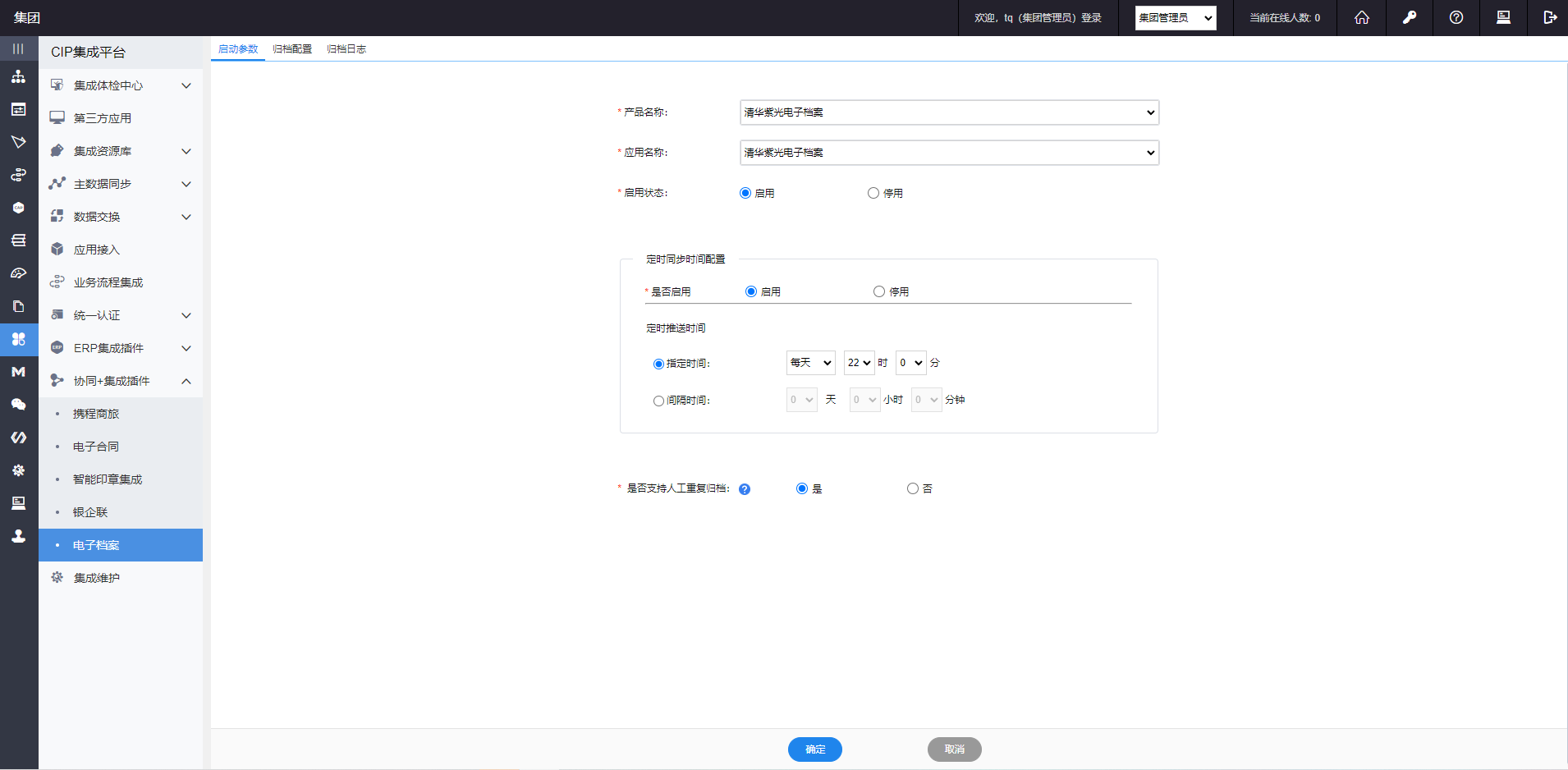 集团管理员将上一小节的基础配置完成后,可进入"CIP集成平台"-"协同+集成插件"-电子档案进行启动参数配置: