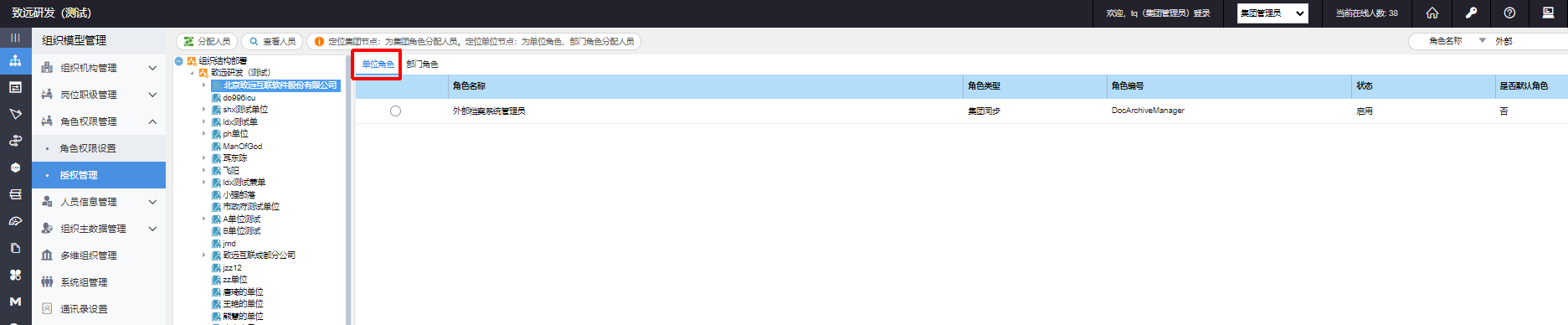 2.新增单位角色【外部档案系统管理员】,用户授权该角色后,可进行归档操作,前端增加"档案系统"菜单,可进行归档记录查询。