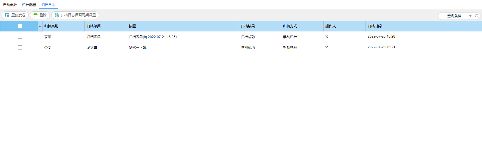 集团管理员可进入后台的归档日志,查看所有归档记录,可进行重新发送(即重新归档),删除记录,归档日志保留周期设置