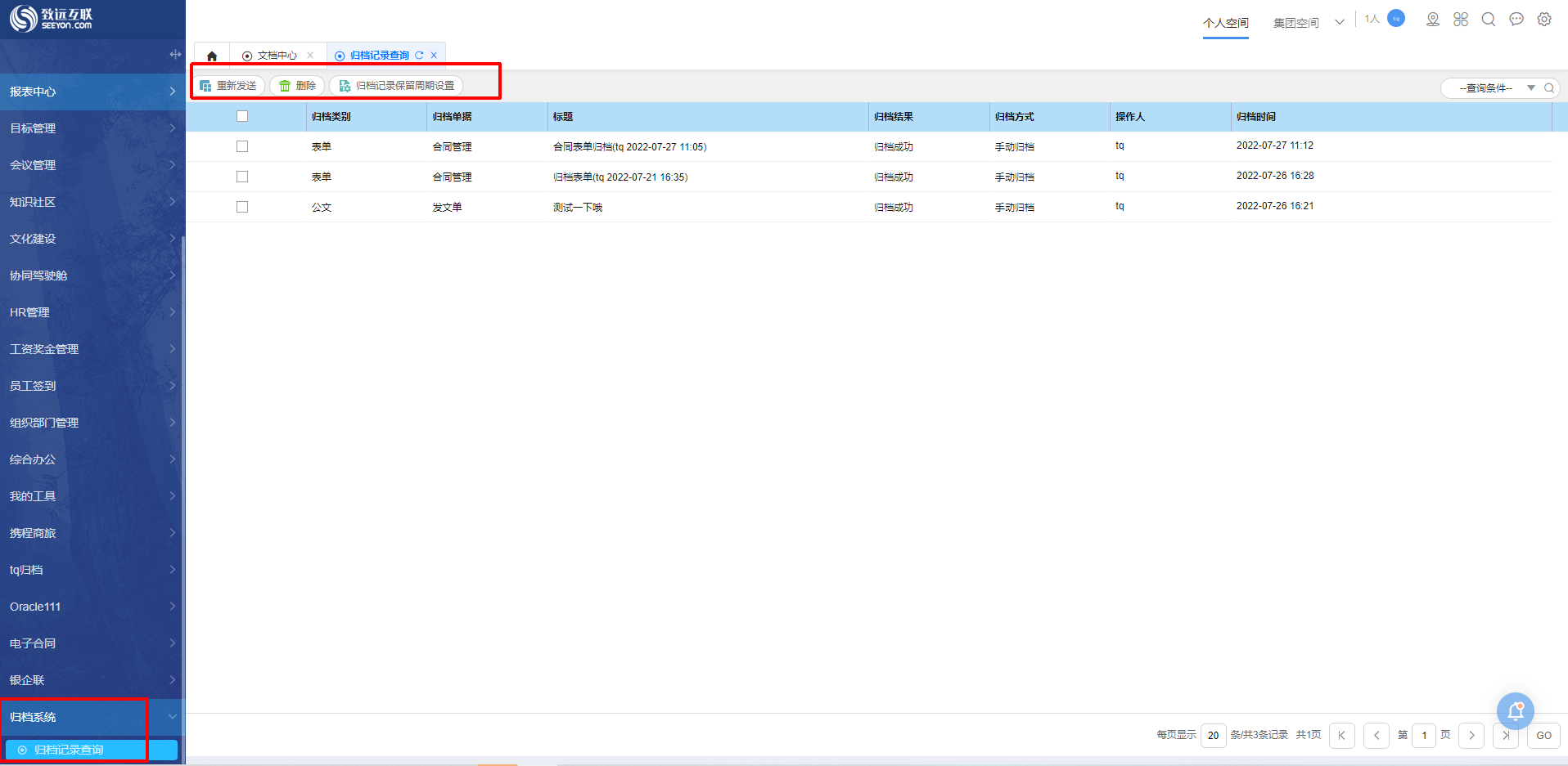 步骤3、归档完成后,用户可进入"归档系统"-"档案记录查询",查看归档记录,并可进行重新发送,删除记录,修改归档记录保留周期操作