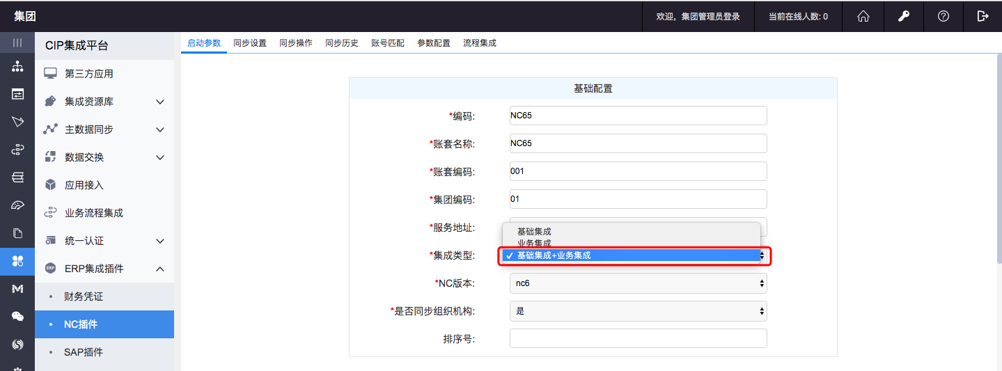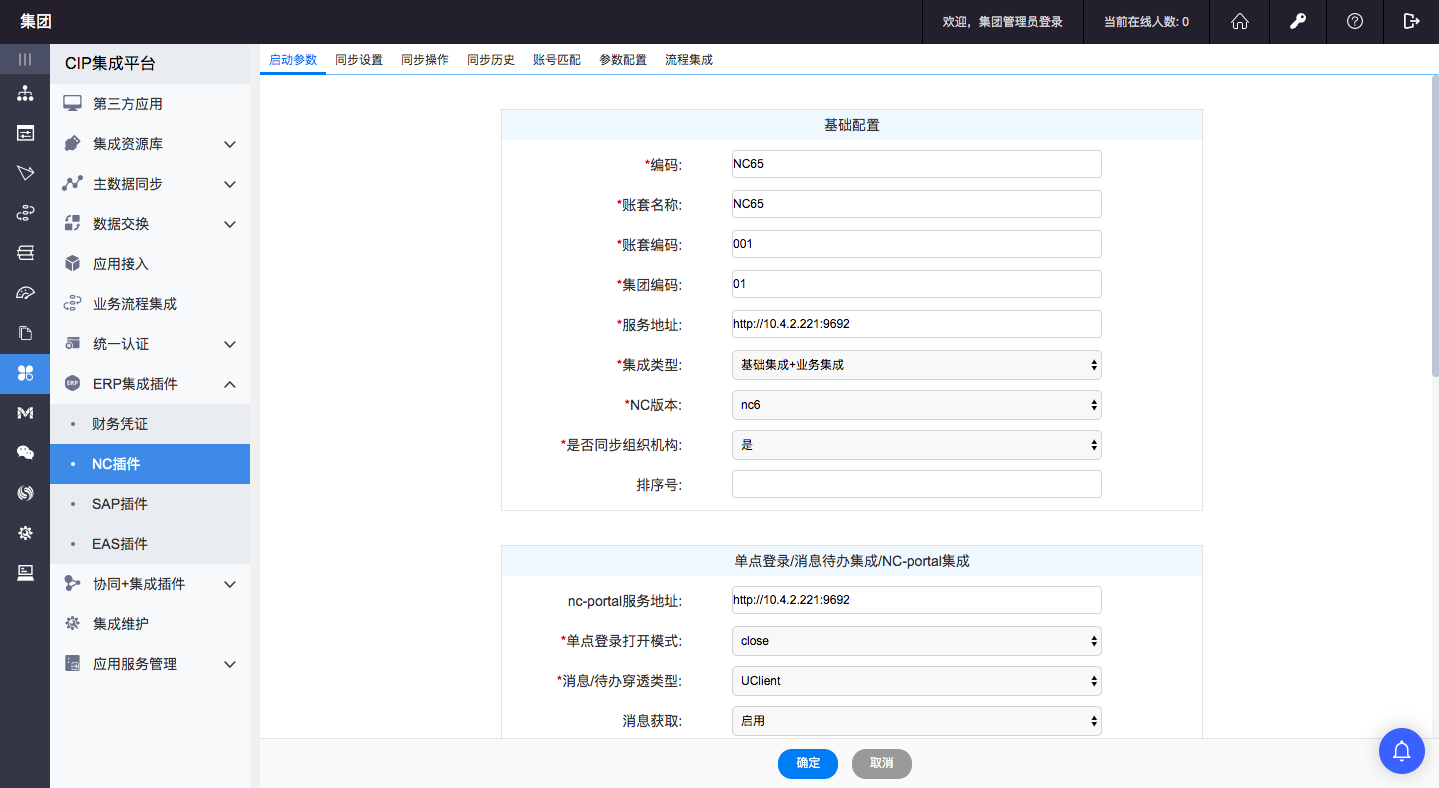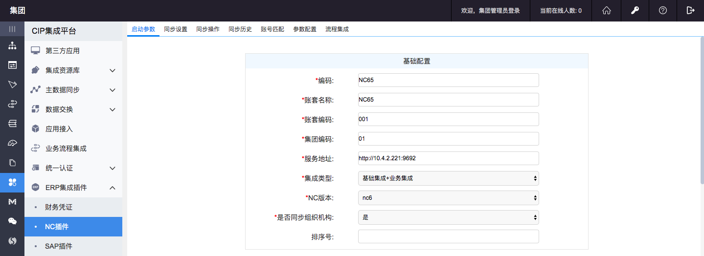 功能说明:CIP集成平台中对NC插件进行参数配置(A8的7.0版本将6.1版本中SeeyonConfig脚本文件中对NC的相关配置移动到CIP集成平台中设置)