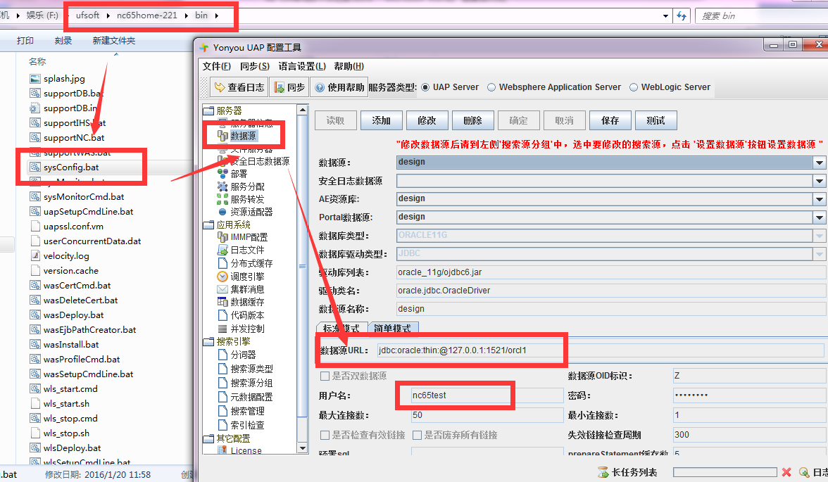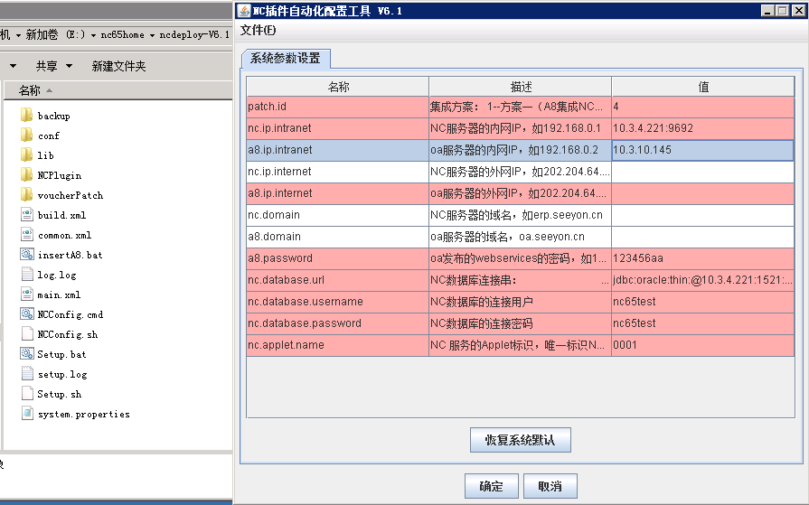 +------+---------------------------------------------------------------+ | { | ar文件到【A8_home】/lib下(如果【A8_home】/lib存在classes12.j | | widt | ar和ojdbc14.jar,则必须删除这两个文件,否则将不能正常运行)。 | | h="0 | | | .427 | A8 为6.1版本: | | 0833 | | | 3333 | <1\ | | 3333 | >如果NC是Oracle数据库,A8是MySQL或者SQLServer数据库,需要从Or | | 3in" | acle的客服端下拷贝ojdbc14.jar文件到【A8_home】/ApacheJetspeed | | hei | /lib下,例如:D:\Seeyon\6.1SP1\ApacheJetspeed\lib; | | ght= | | | "0.5 | <2>如果NC是Oracle11g数据库, | | in"} | NC-OA协同是SQLServer数据库,需要从Oracle的客户端下【Oracle_cl | | | IEnt_home】/clIEnt_1/jdbc/lib下的ojdbc5.jar文件到【A8_home】/ | | | ApacheJetspeed/lib下(如果【A8_home】/ApacheJetspeed | | | /lib存在classes12.j | | | ar和ojdbc14.jar,则必须删除这两个文件,否则将不能正常运行)。 | | | | | | **说明五:**检查OA的ip地址是否配置正确 | | | | | | 在NC安装目录下找到E:\nc65home\modules\trans 下的 | | | system.properties文件 | | | | | | 查看OA的地址是否配置正确,以及webservice密码是否配置正确 | | | | | | {width="6.0in" | | | height="2.9520833333333334in"} | | | | | | **说明六:**手动同步时间系统默认设置为2000-01-01 00:00 | | | | | | {width="6.0in" | | | height="2.7625in"} | | | | | | 如果手动同步后数据有问题,可修改该时 | | | 间,比如2018-01-02对同步数据做出修改,可设置时间为2018-01-01 | | | | | | **说明七:**组织数据同步后,出现问题可参考 [五 | | | 常见问题与解决方案] | +======+===============================================================+ +------+---------------------------------------------------------------+