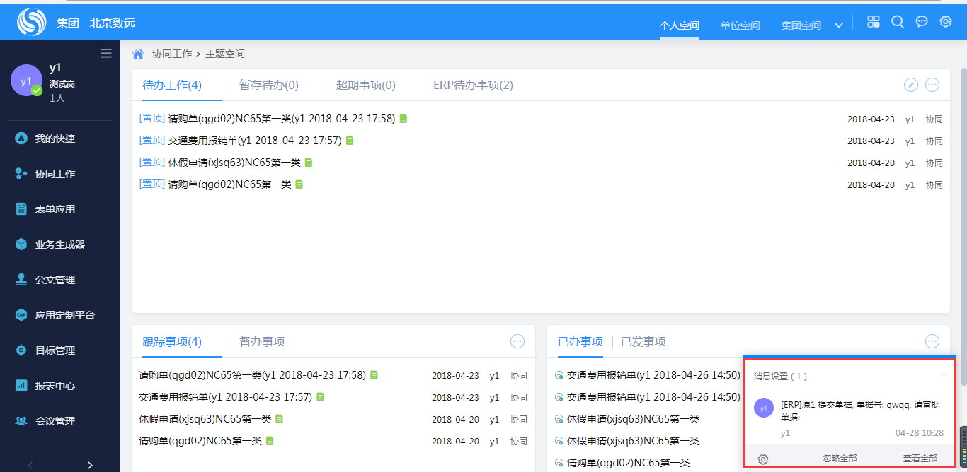 第五步:多NC消息集成。账号匹配成功后,可在OA中接收多NC中对应用户的消息。不同NC的消息以前缀区分。