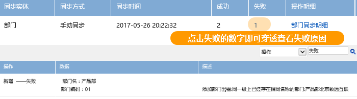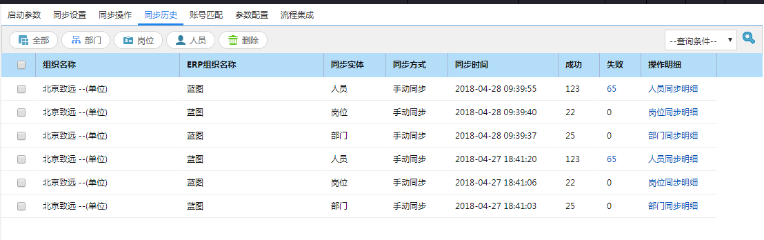 三、使用集团管理员看同步历史,查看问题部门是否同步成功,如果失败,查看问题描述,同时也可以在OA的安装目录下D:\a8\103958apps\logs_sy 目录下查看ctp.log日志文件,在该文件中查看同步日志;