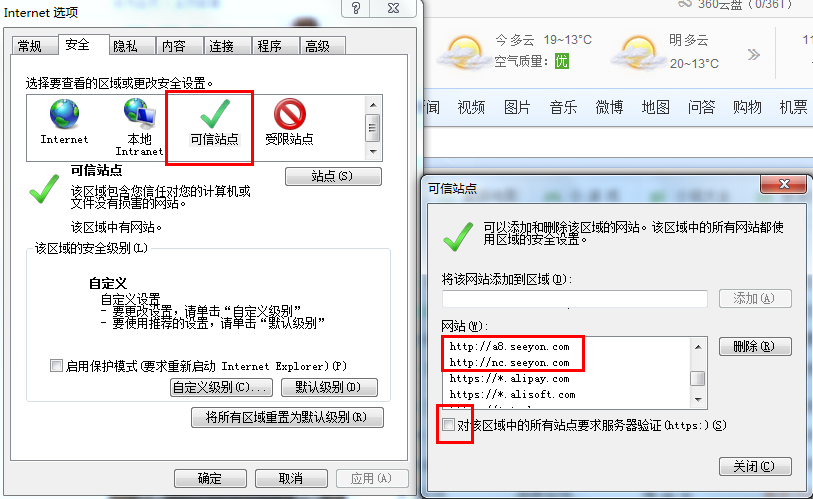 ②IETERNER选项:添加NC网址为受信任的站点;并且在自定义级别启用:"对标记为可安全执行脚本ActiveX控件执行脚本"、"对未标记为可安全执行脚本的ActiveX控件初始化并执行脚本"、"二进制文件和脚本行为"这三项。