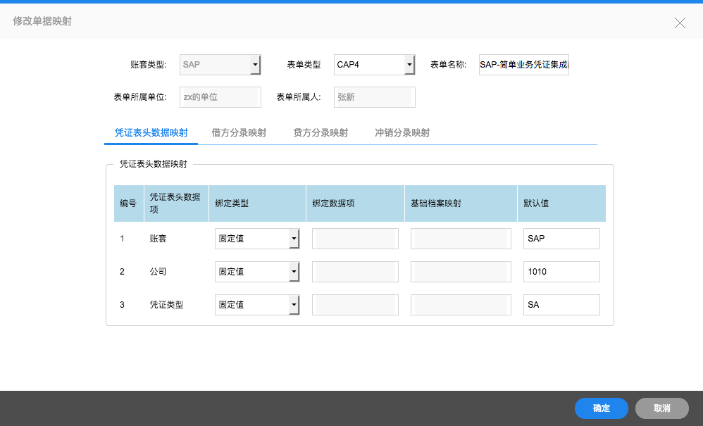 所有对应了SAP系统档案型数据的字段(公司、科目、成本中心等),默认最终值都是传SAP系统相关档案的档案编码。