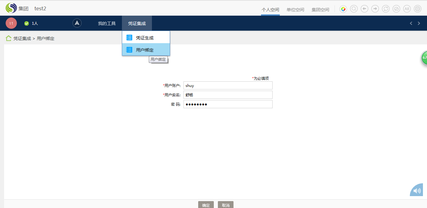 操作步骤:登录分配了用户绑定菜单权限的人员, 点开菜单:凭证集成用户绑定,录入SAP系统对应的用户账户、用户实名和密码。