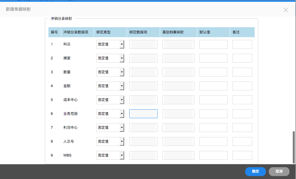 ⑤"冲销分录映射"设置凭证冲销分录与OA表单数据项的对应和转换关系。冲销分录可以与同一OA重复表和主表绑定,不能跨重复表绑定。