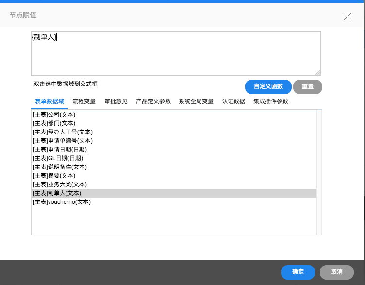 表单单项数据:选择此项,需要选择绑定数据项,即流程表单中的对应字段。如果该字段已经做好档案映射,需要在基础档案映射中选择对应映射。