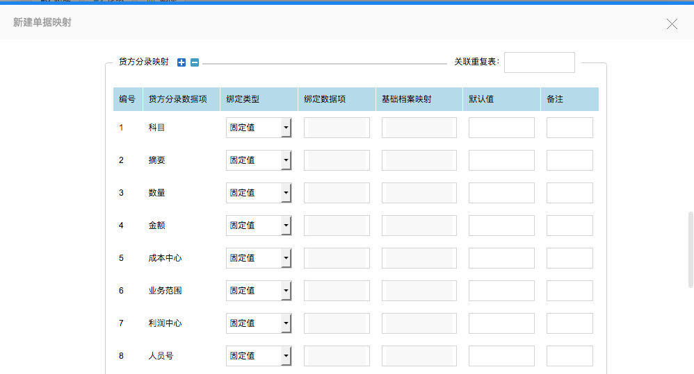 ③"贷方分录映射"设置凭证贷分录与OA表单数据项的对应和转换关系。贷方分录可以与同一OA重复表和主表绑定,不能跨重复表绑定。可以设置多个贷方分录映射。
