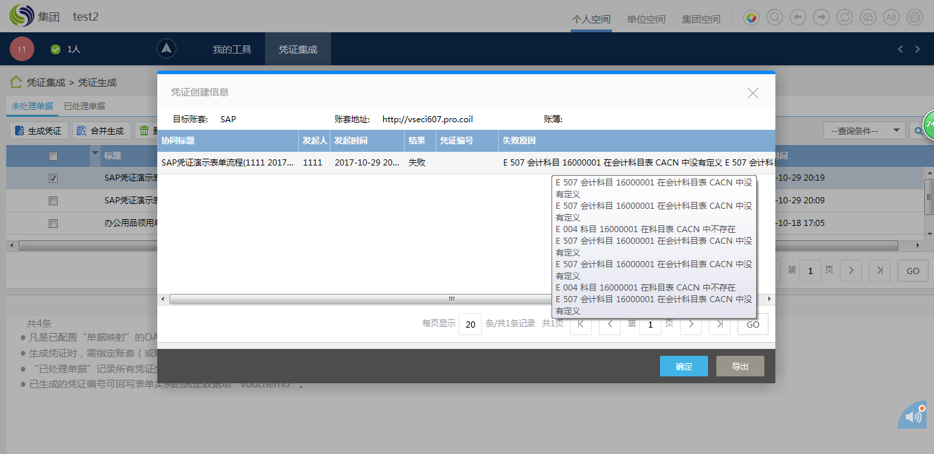 a. 生成凭证按钮:批量在SAP系统生成凭证,每一个报销单生成一条凭证;
