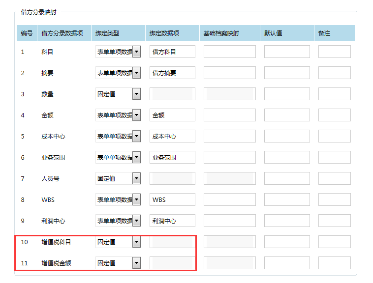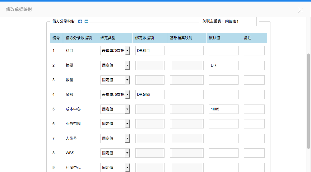 ②"借方分录映射"设置凭证借方分录与OA表单数据项的对应和转换关系。借方分录可以与同一OA重复表和主表绑定,不能跨重复表绑定。可以设置多个借方分录映射。