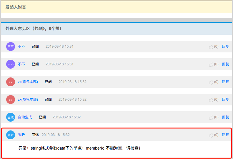 第七步:超级节点任务完成设置后,实际单据在自动生成凭证时,如超级节点出现异常,会按照超级节点任务配置的异常处理规则在表单意见处理区显示异常内容;