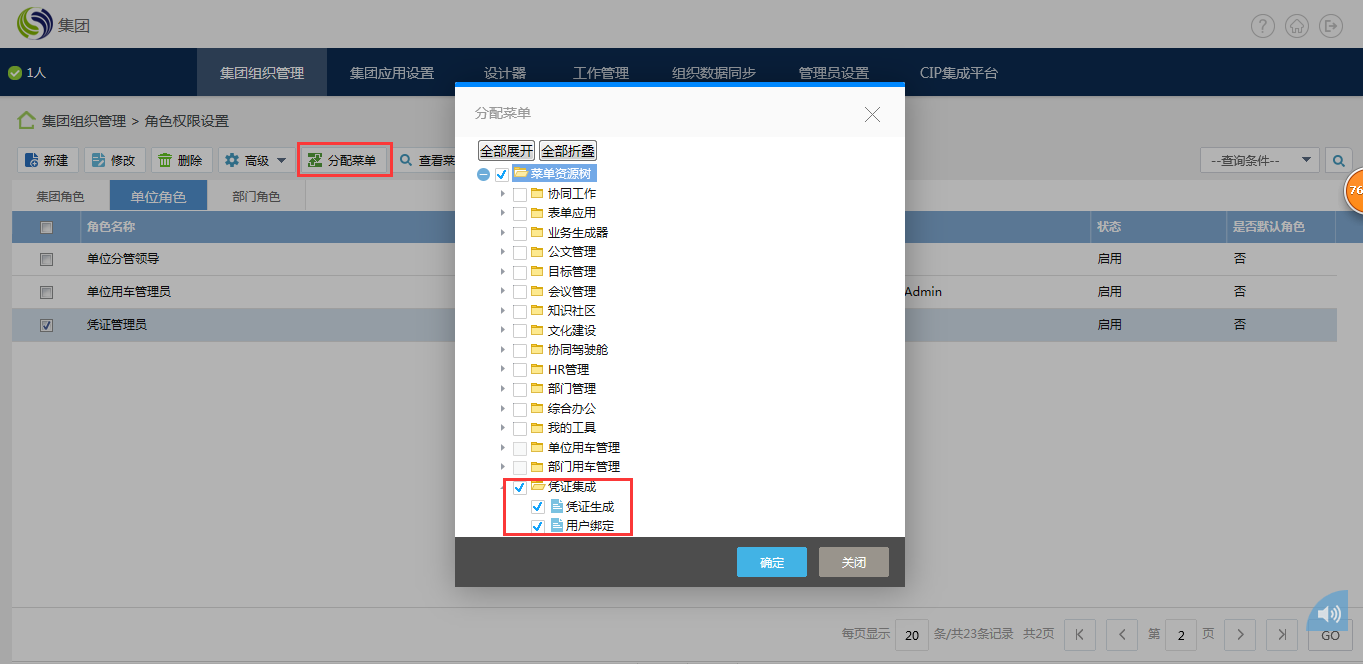 操作步骤:使用集团管理员或单位管理员登录,在"角色权限设置"中,对新建角色或原有角色分配菜单,选中"凭证集成-凭证生成"。