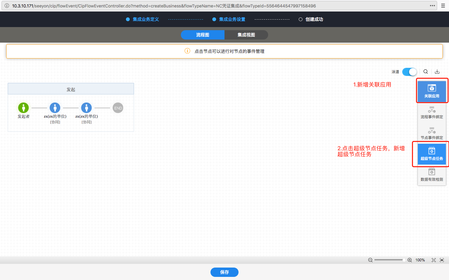 第六步:超级节点任务完成设置后,按照如下截图配置:在流程中添加超级节点;关于自动生成凭证可以在会计节点最后添加超级节点;