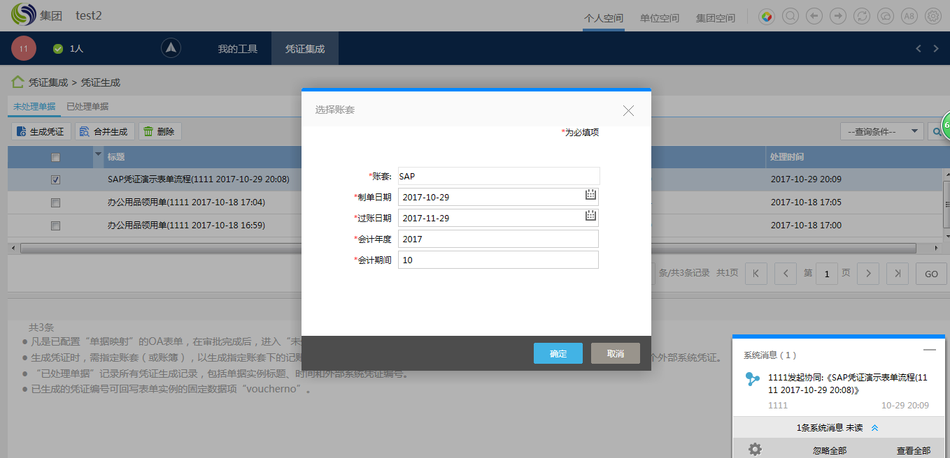 操作步骤:选中要生成凭证的流程表单,然后点击"生成凭证",在弹窗内可选择账套、制单日期和过账日期,会计年度和会计期间根据制单日期自动生成,也可手动填写会计年度和会计期间,全部为必填项。