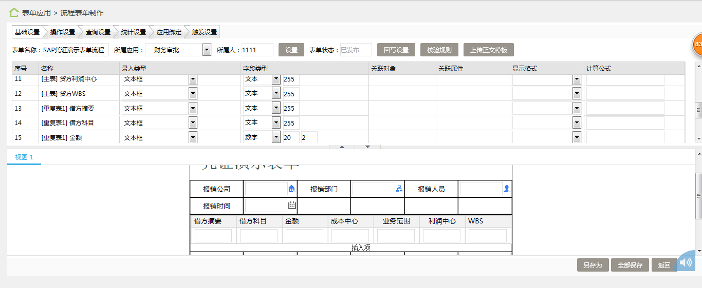 功能说明:将流程表单中的字段与SAP财务凭证字段进行映射配置。