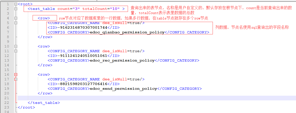 1、一级元素为Document根元素,只有唯一一个,名称为“root” 2、二级元素为“root”的子元素,定义为表名称,名称自定义但不允许重复,可以有多个 3、三级元素为表元素的子元素,定义为表中行记录,名称固定为“row”,可以有多个 4、四级元素为“row”的子元素,定义为字段,名称自定义但不允许重复,可以有多个,字段的值为数据值