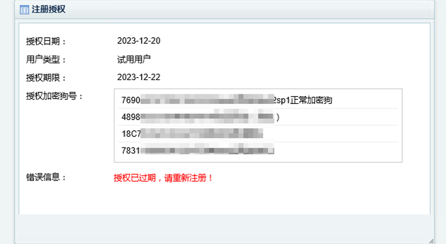 如果授权文件正确,且在授权有效期,通过【注册授权】功能查看到授权信息如下: