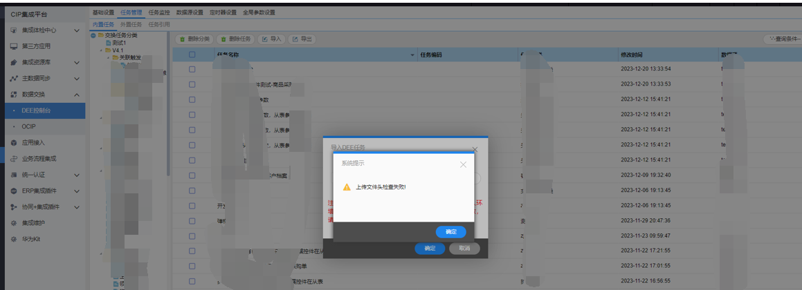 | 导入 | 上传文件头检查失败 | 未打补丁的DEE引擎导入新的授权的DEE任务 | DEE引擎打补丁 | ![]() |